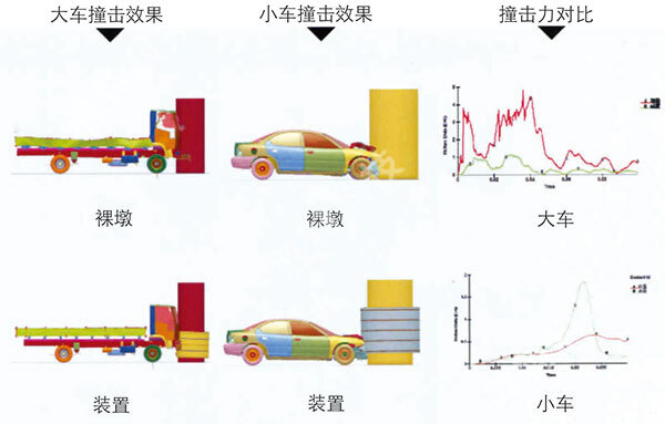 由撞擊效果對(duì)比可見,增設(shè)防車撞設(shè)施后,能夠有效地降低車輛撞擊力60%以上,延長(zhǎng)撞擊時(shí)間,減少車輛破損,從而達(dá)到保護(hù)人員、橋墩和車輛的目的。